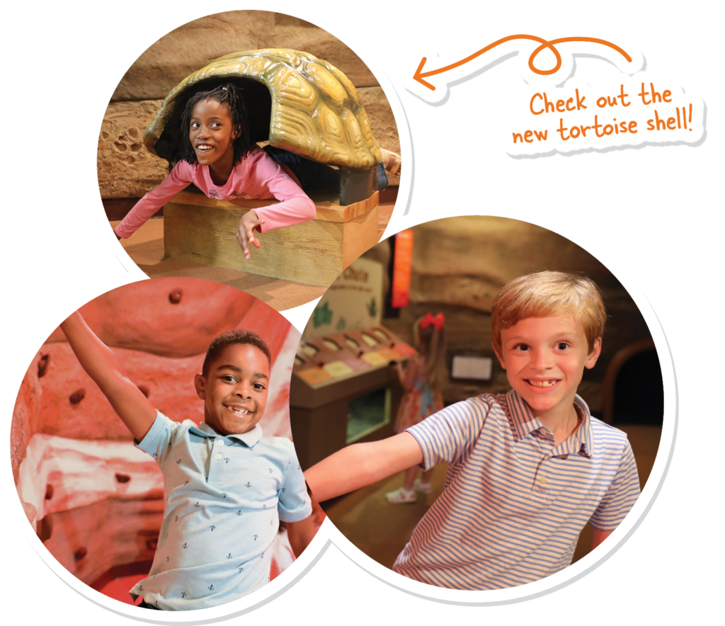 The newly renovated Underground exhibit takes visitors beneath Mississippi to explore both the Jackson Volcano and the hidden world of burrowing animals. Children can jump across “magma” in the interactive Lava Leap! activity while learning how volcanoes form, why Jackson sits atop an extinct volcano, and what the region looked like 74 million years ago. Fossil graphics and layered-earth diagrams enrich the geological story. Nearby, a new gopher tortoise zone allows children to climb into a tortoise shell, explore burrows as long as a school bus, and discover why this endangered species is a vital keystone animal supporting hundreds of underground creatures.