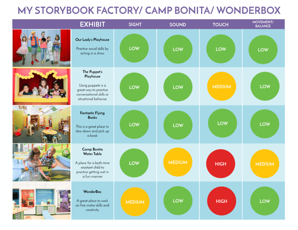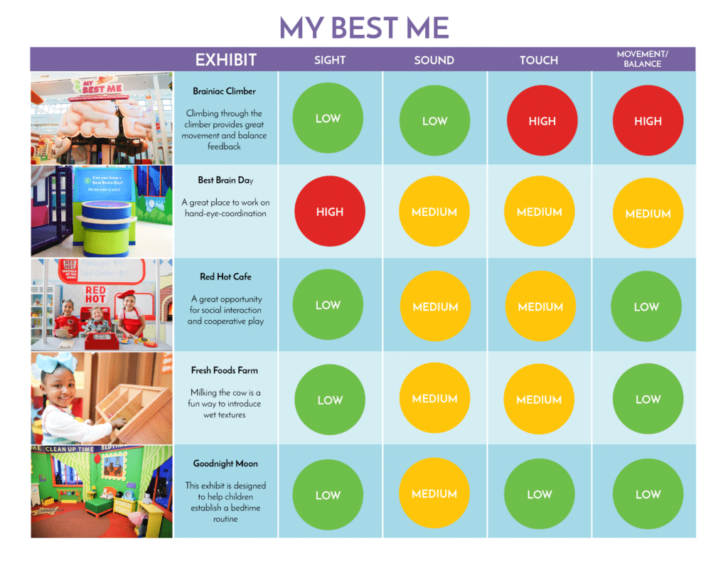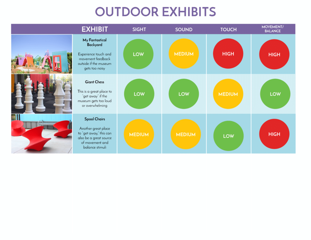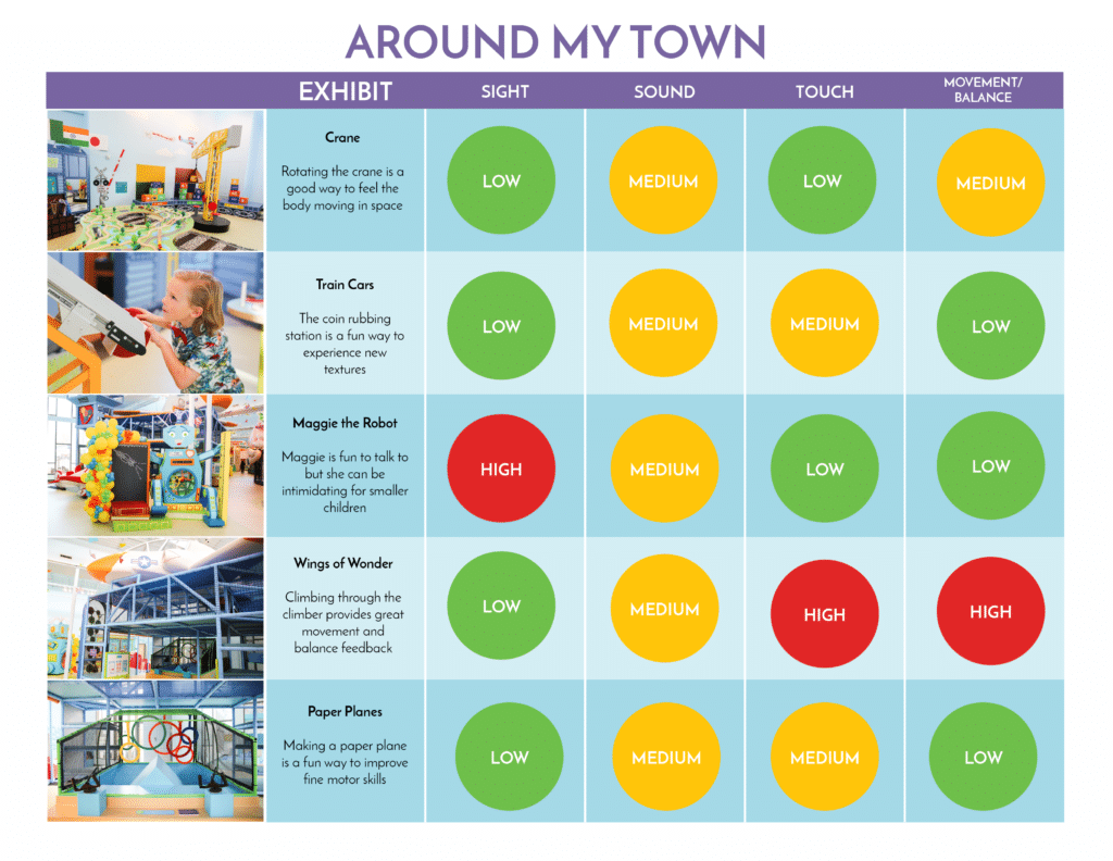 The Sensory Map at the bottom of the page describes the types of sensation that visitors will experience at each exhibit and gives a rating of LOW, MEDIUM, OR HIGH. Visitors with sensory difficulties can use the Sensory Map to work on areas of sensory need or avoid potentially difficult areas of the museum.