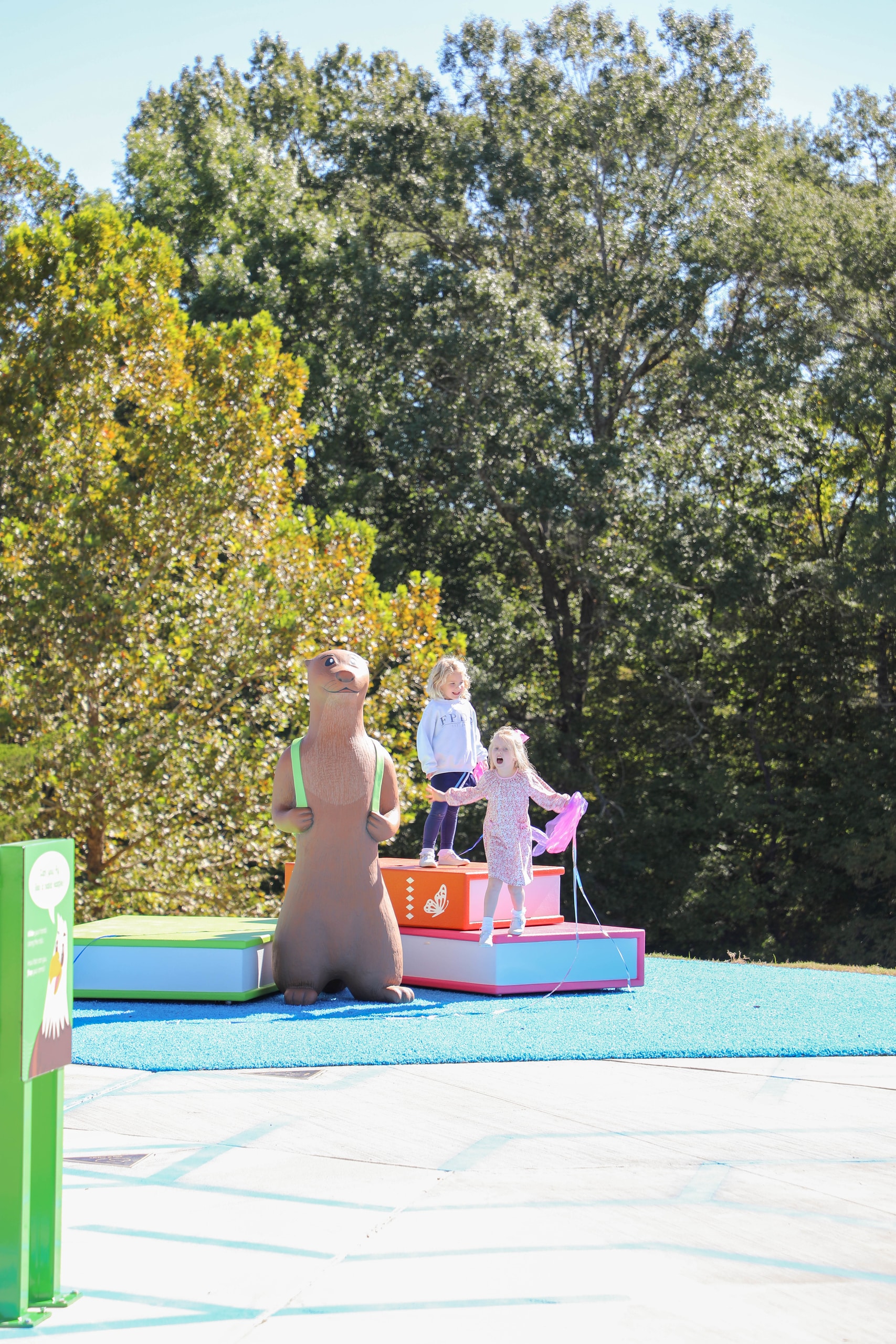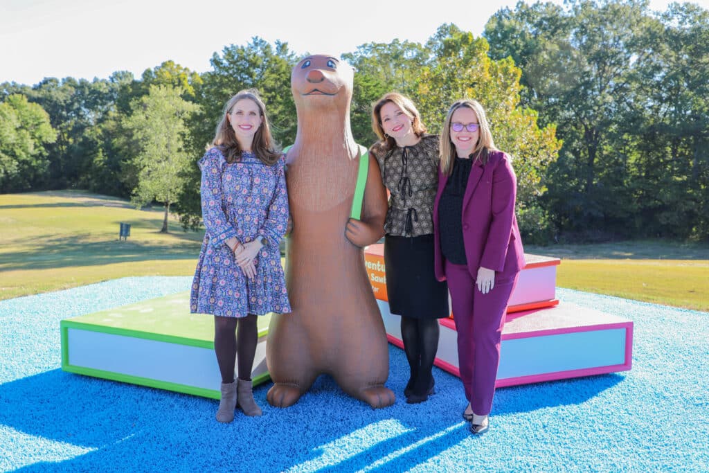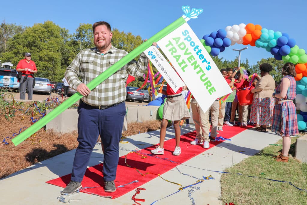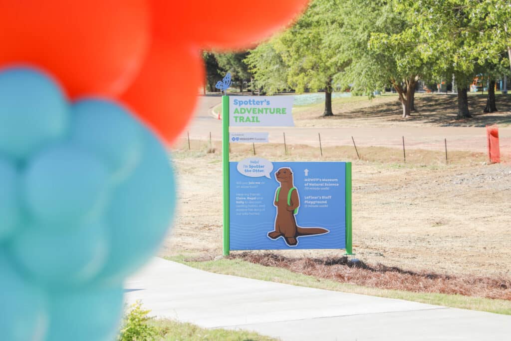 Spotter’s Adventure Trail will connect Mississippi Department of Wildlife, Fisheries, and Parks’ Mississippi Museum of Natural Science (MMNS), the Mississippi Children’s Museum (MCM), and the LeFleur’s Bluff Playground, a state-of-the-art playground that has welcomed 100,000 visitors since opening in December of 2021. The 8-foot-wide trail features a fun and interactive outdoor experience with Spotter the Otter and friends, designed and illustrated by MCM’s Senior Graphic Designer, Lori Nesbit. Characters were brought to life through stories and exhibit elements by MDWFP’s staff and MCM’s Education Team, which was led by William Moore, Assistant Director of Exhibits.